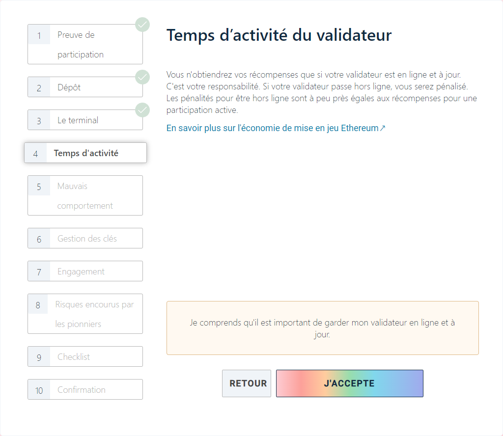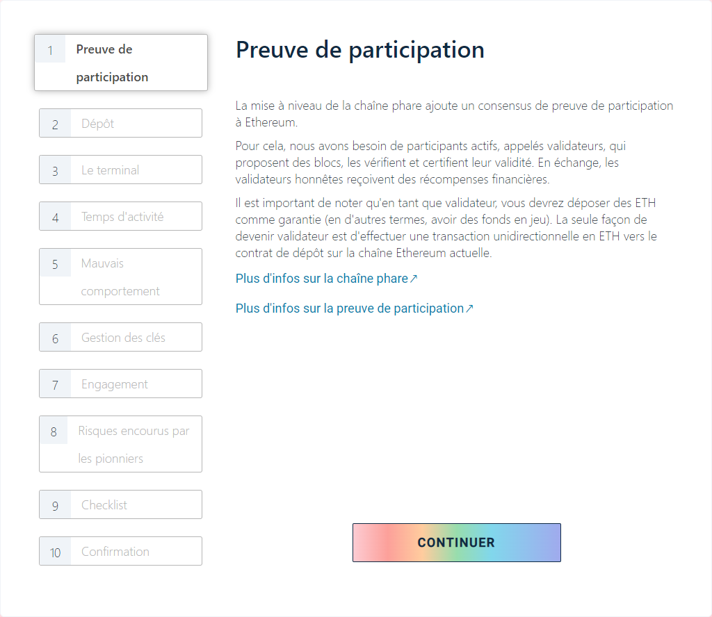 Une fois que vous avez configuré votre machine avec un client d'exécution et un client de consensus, vous êtes prêt à commencer le processus de dépôt.
